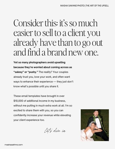 Every email is written to sound conversational and aligned with a high-end client experience, so your offers come across as thoughtful recommendations, not sales pitches. You’ll learn how to confidently present upgrades like extra coverage or albums as an extension of your service—not an upsell.