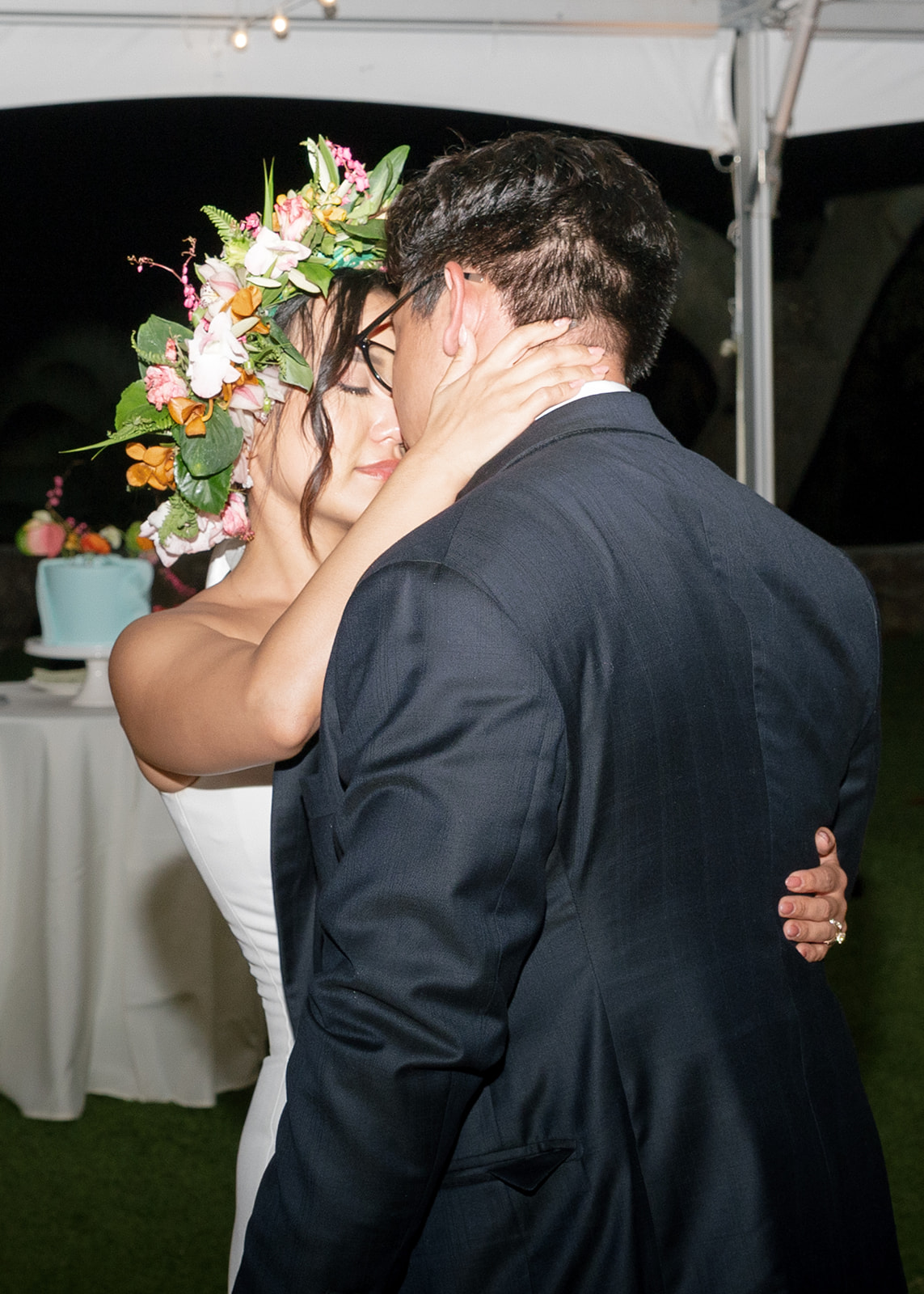 The reception continued this blend of elegance and simplicity. Long wooden tables, draped in soft linens, were adorned with simple yet beautiful floral arrangements, allowing the venue’s natural beauty to remain the focal point. The soft glow of candlelight and the live band playing in the background created a warm, inviting atmosphere. Guests mingled and laughed, savoring local Hawaiian delicacies as the evening unfolded effortlessly.