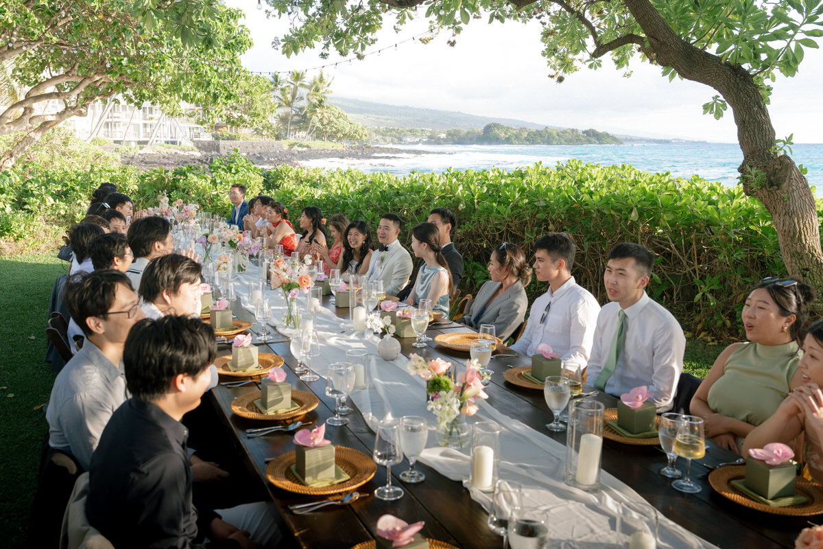 Set directly on the lāe, with the ocean wrapping around the property and lava rocks framing the shoreline, Kona Beach House offered exactly what this couple was drawn to: openness, intimacy, and the freedom to let the day move organically from one moment to the next. The ceremony, dinner, and celebration all took place within the same space — transformed not by excess décor, but by light, movement, and the energy of the people gathered.