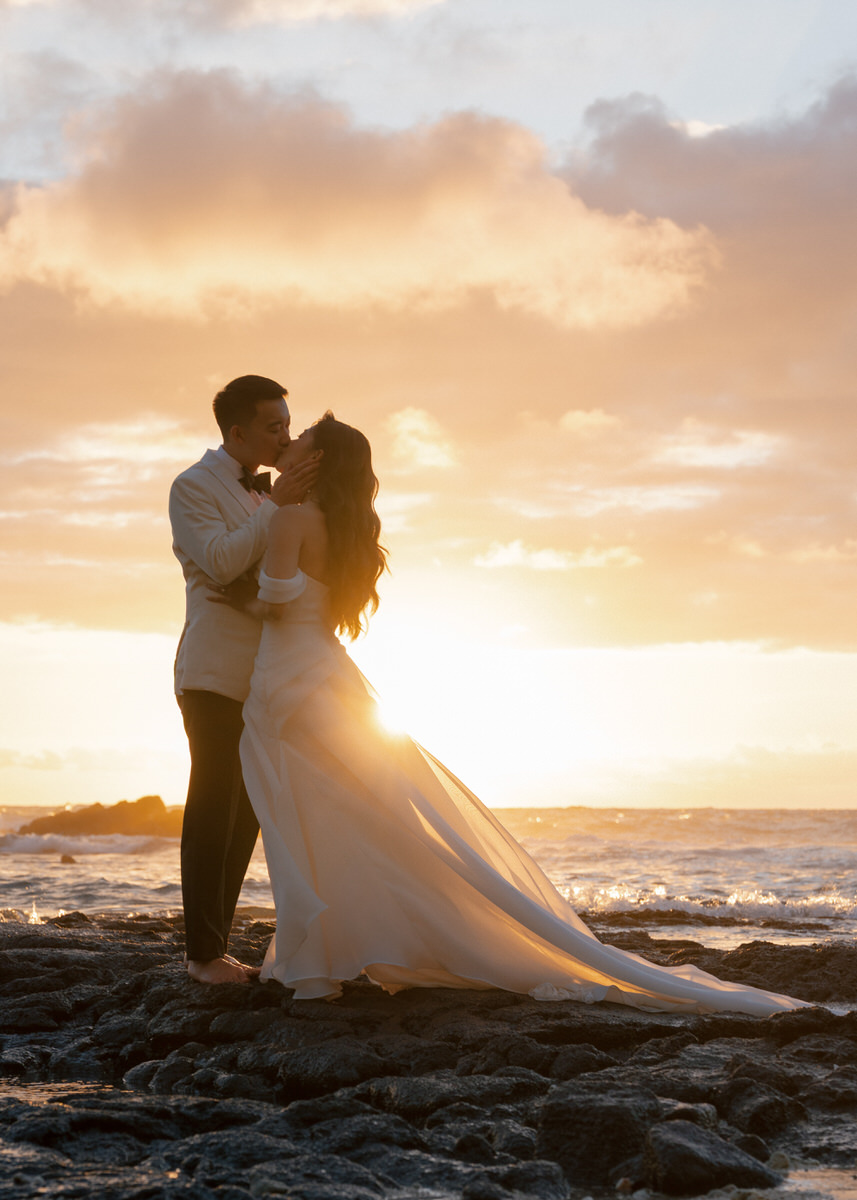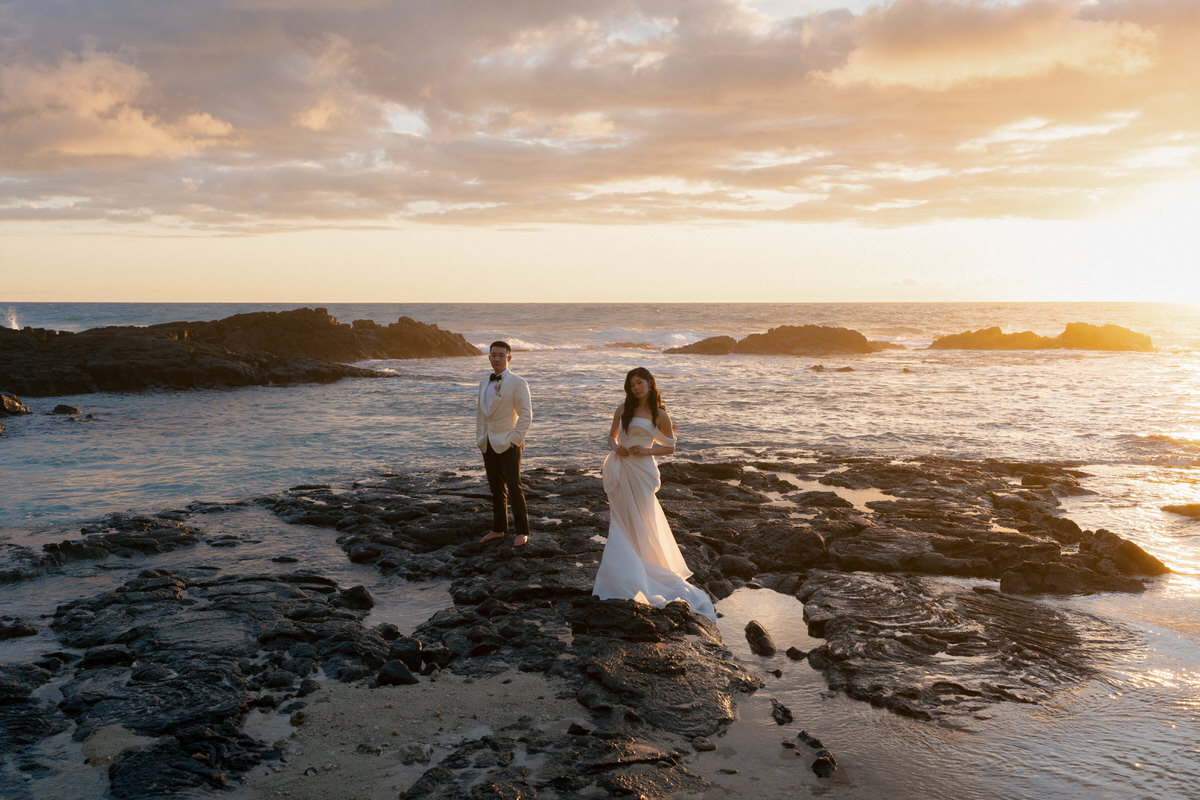 As the sun dipped lower, we slipped away briefly for portraits along the lava rocks at the edge of the water. These moments felt especially true to who Kathy and Jeff are — quiet, grounded, and deeply connected to their surroundings. The ocean reflected the last light of the day, and the contrast between the dark stone and the softness of Kathy’s gown created something timeless and cinematic without ever feeling staged.